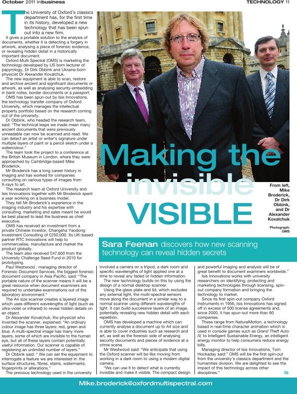 Making the Invisible Visible June 17, 2012 · by Saronimo · in Business, Published. · InBusiness Sept 2011 Published in The Oxford Times InBusiness magazine Share this: Share on X (Opens in new window) X Share on Facebook (Opens in new window) Facebook Like Loading...